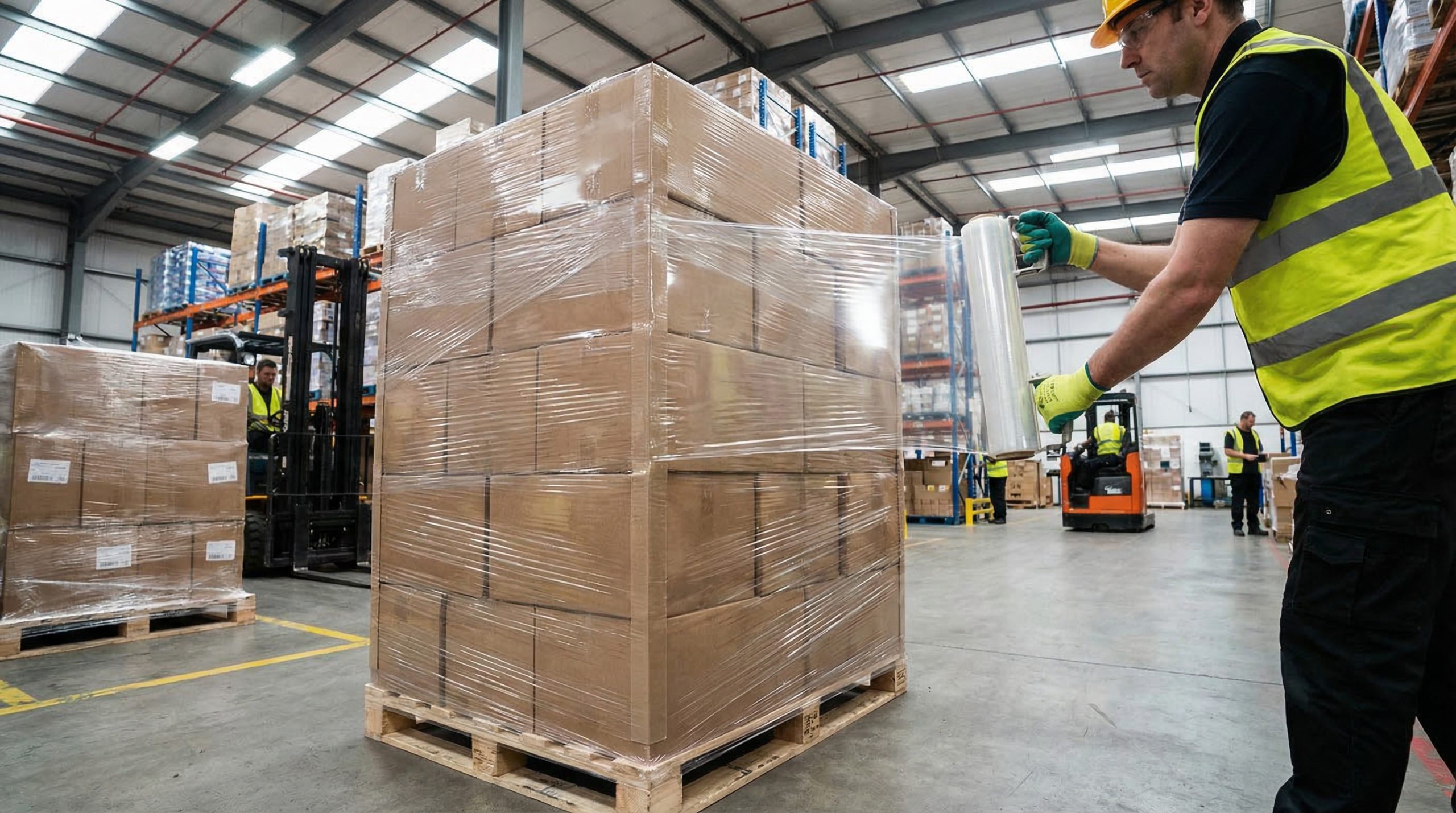 A professional warehouse scene showing a worker wrapping a fully stacked pallet with a clear stretch wrap roll, with neat boxes secured on …